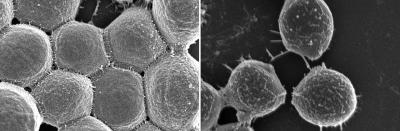 Images taken with a scanning electron microscope show wild-type bacteria (left) forming tight aggregates or clumps in the presence of blood proteins. In contrast, cells of the mutant strain (right) over produce a giant surface protein, have a spiky appearance, and do not clump tightly together. This clumping defect makes the mutant strain less deadly in an experimental model of the serious staph infection, endocarditis.