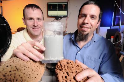 Georgia Tech researchers (l-r) Daniel Goldman and Michael Goodisman pose with a tube containing simulated soil used to study tunnels being made by fire ants. They are holding examples of nests made by the ants in the wild. The information could be useful in developing future generations of robots able to work in confined spaces.