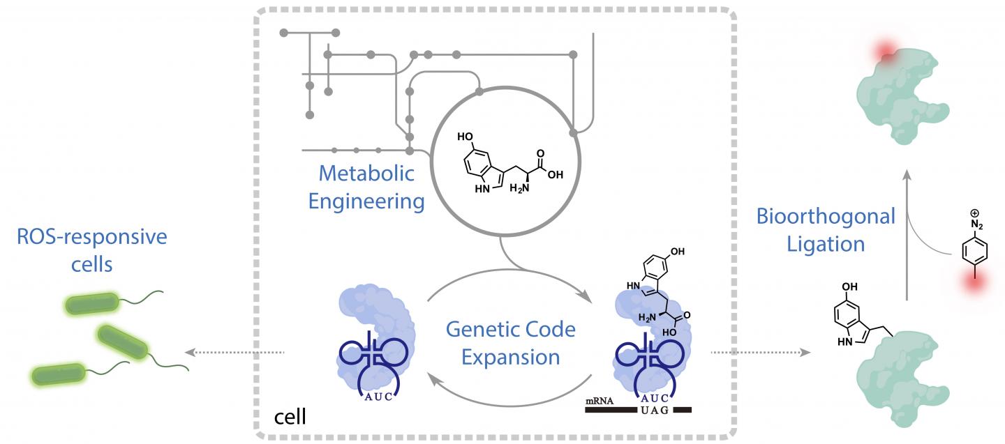 "These 5HTP-containing proteins, isolated from the programmed bacteria, can be further labeled with drugs or other molecules," Xiao said. "Here, we show the strain itself can serve as a living indicator for reactive oxygen species, and the detection limit is really low."