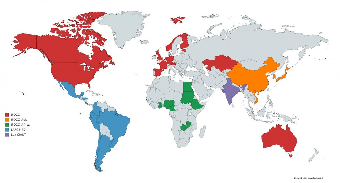 image: Overview of the currently included countries in the IPDGC and IPDGC-affiliated efforts. IPDGC = International Parkinson Disease Genomics Consortium, LARGE-PD = Latin American Research Consortium on the Genetics of Parkinson Disease, Lux GIANT = Luxembourg-German-Indian Alliance on Neurodegenerative diseases and Therapeutics.