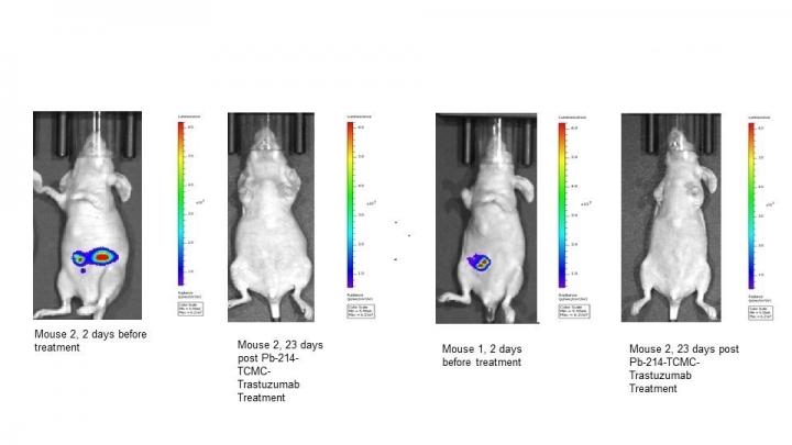 Compared to the Pb-214-TCMC-IgG and control groups, the tumor signal for mice and cells treated with Pb-214-TCMC-trastuzumab decreased dramatically over the course of the study, signaling the efficacy of the therapy. There were no adverse side effects from the treatment as determined by weight loss of all animals surviving.