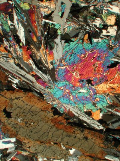 Cross-polarized transmitted-light image of a lunar rock reveals its hidden beauty. In broad daylight the rocks are an unprepossessing -- even an ugly -- gray.