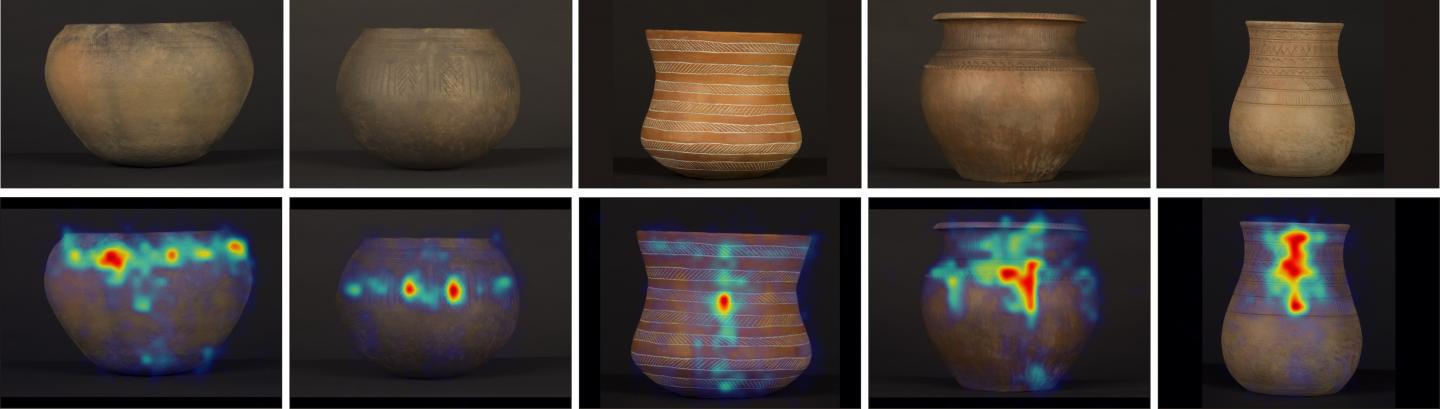 image: Main ceramics analyzed in the experiments and heatmap of the visual fixations in each one of them. The images are organized, from left to right, in chronological order from oldest to most recent. Following time, the fixations direction changes from horizontal to vertical.