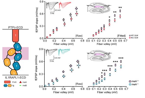image: The diagram on the left depicts the interaction of presynaptic PTPδ with postsynaptic IL1RAPL1 in the synapse, with the crucial meA structure shown as the red triangle. The graphs on the right show decreases in synaptic transmission in the hippocampus of mice with PTPδ deletion (top) and PTPδ-meA deletion (bottom).