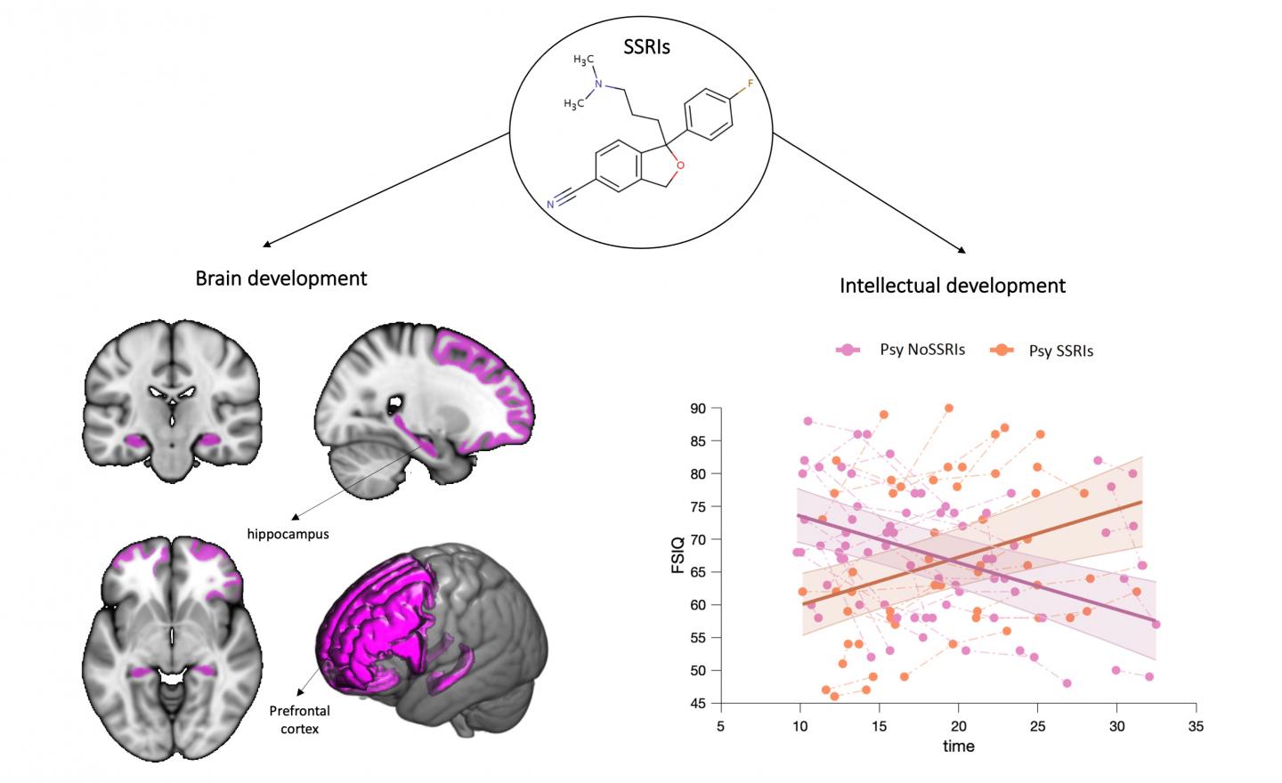 image: Effects of SSRIs on brain and intellectual development. on the left side: brain map showing regions of the brain protected by the prolonged administration of SSRIs comprising a network of prefrontal and limbic sructures. On the right side: plot displaying an increase in IQ scores in subjects treated with SSRIs as opposed to the IQ decrease in subjects not treated with SSRIs.
