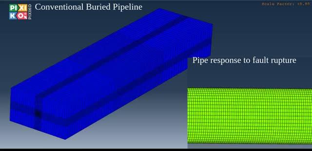 video: An advanced three-dimensional computer model to assess the mechanical performance of a pipeline protected by proposed polymer blocks under a strike-slip (horizontal) fault rupture.