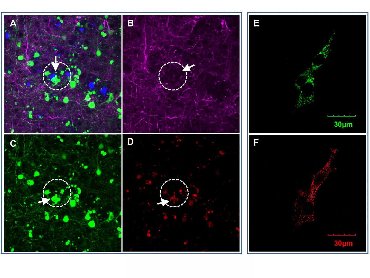 image: In the brain of mice with Alzheimer's, areas near amyloid plaques (A) appear with fewer neural networks (B), dying neurons (C) and higher OCIAD1 (D). In cultured neuronal cells, the OCIAD1 proteins (E) appear in the mitochondria (F).