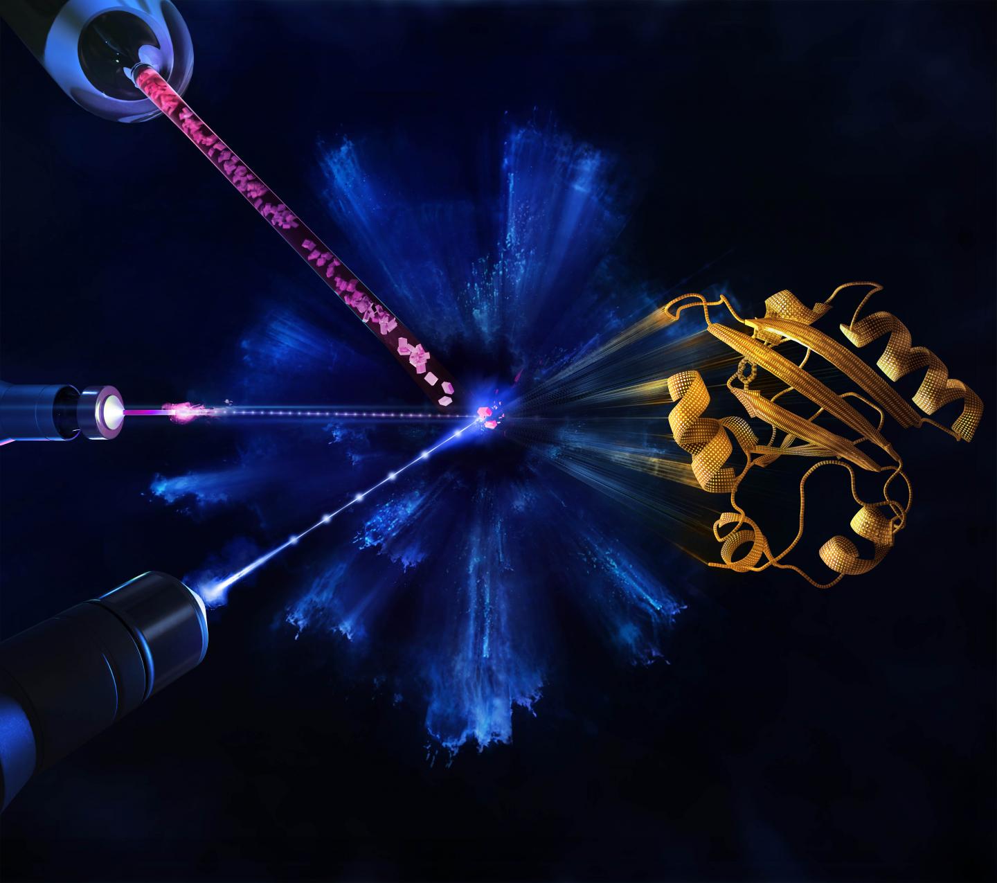 image: In this illustration, microcrystals are injected (top, left) and a reaction is initiated by blue laser pulses hitting the proteins within the crystals (middle, left). The atomic structure of the protein (right) is probed during the reaction by the X-ray pulses (bottom, left). At the European XFEL, femtosecond optical laser pulses match the X-ray pulses that fire at a megahertz rate. X-ray pulses are six orders of magnitude larger than that at other X-ray sources. This makes it possible to produce diffraction patterns for nearly any protein, yielding still images recorded over unimaginably rapid time increments that form molecular movies.