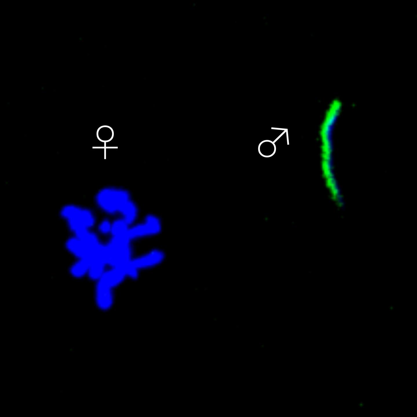 image: Maternal (?) and paternal (?) chromosomes in a recently fertilized fruit fly egg. DNA is in blue; the paternal chromosomes are also labelled in green.