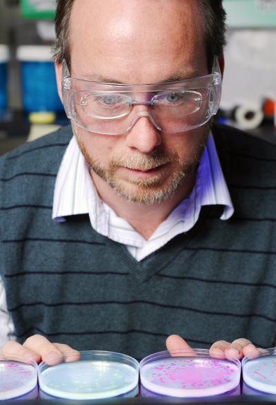 Eric Gaucher, an associate professor in the Georgia Tech School of Biology, examines resurrected proteins from an evolved family of fluorescent proteins. This work is being used to validate the tools he uses in the laboratory to resurrect ancient proteins.