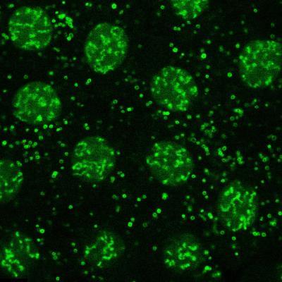 Histones (shown in green) in fruit fly embryos. They are stored on lipid droplets (small dots/rings) and -- when needed -- travel to nuclei (large spheres) to package DNA into chromosomes.