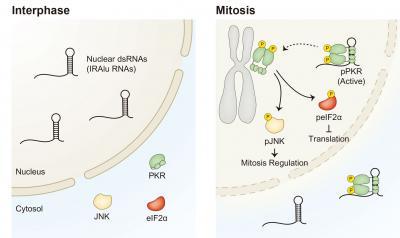 For the first time, the IBS research team has found that during mitosis, the cellular dsRNAs activate PKR, an enzyme previously known as a trigger of immune response during virus infection. Activated PKR then regulates protein synthesis and orchestrates mitotic processes. Disruption of PKR activation resulted in misexpression of mitotic factors, delay in mitotic progression, and ultimately defects in cell division.