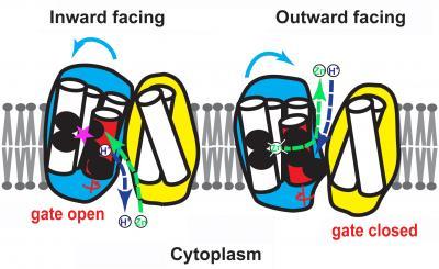 Outside the membrane is an abundance of protons, with a lower concentration inside the membrane, creating what is known as a concentration gradient. The protons want to flow "down" this gradient into the cell, like water following gravity down a waterfall, says Fu. Thus, when the central pocket of the transporter protein is open to the outside, a proton will bind to the pocket.