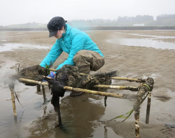 image: Amy Ehrhart checking transplanted oysters along the Pacific Coast.