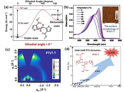 Particularly, a remarkable efficiency of 16.20% can be realized by blending PTVT-T with the acceptor eC9, and the corresponding devices show good stability, i.e., the cells can maintain over 80% of the initial efficiency after continuous illumination of AM 1.5G for about 500 hours.