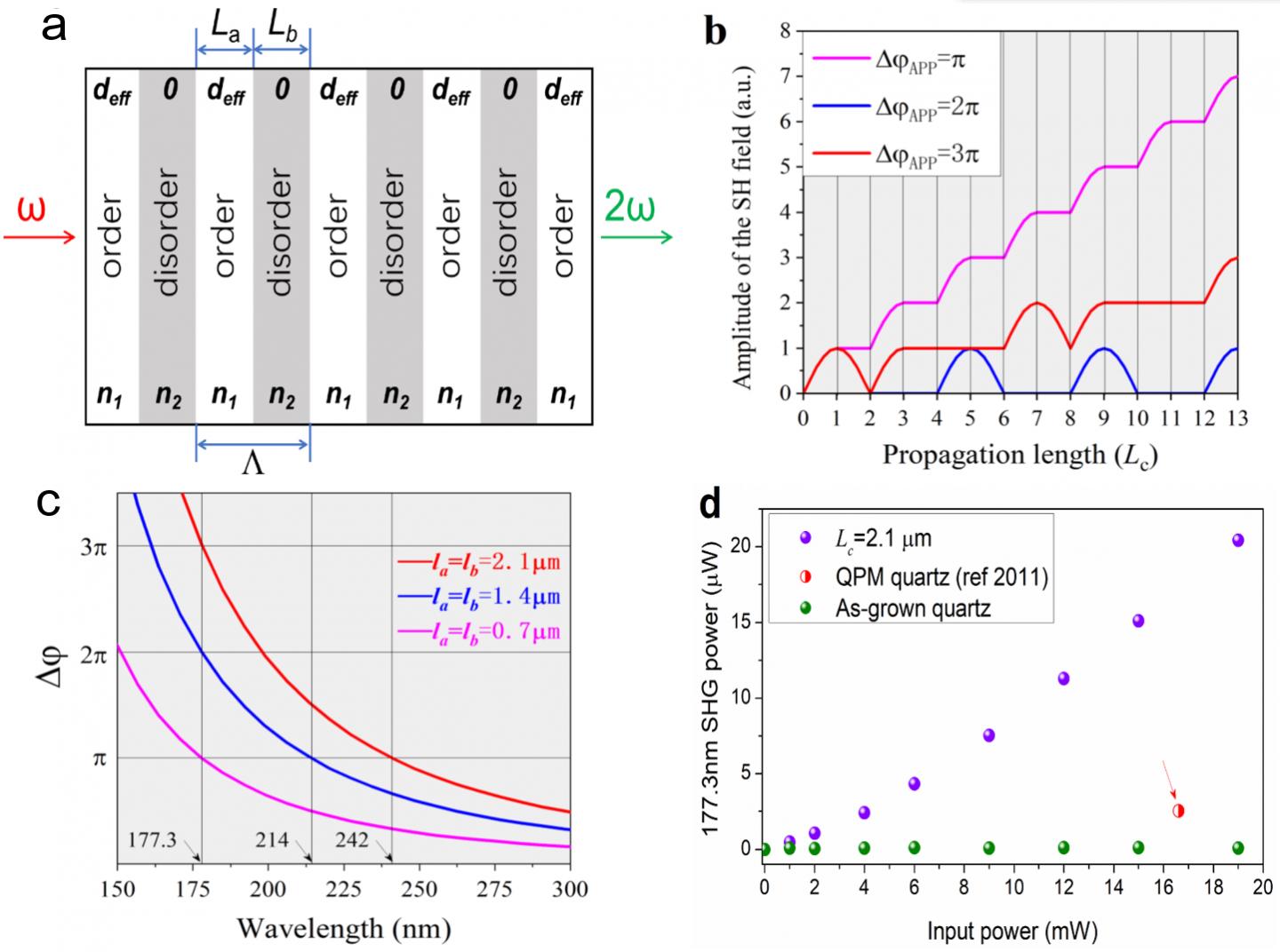 image: (a) Schematic graph of additional-phase-matching condition in arbitrary nonlinear optical crystals. The white and grey regions represent ordered crystal and disordered amorphous, respectively. The period length Λ equals the sum of ordered width La and disordered width Lb (Λ = La + Lb). Notably, La and Lb may be equivalent to coherent length Lc or integral multiple of Lc. deff/0 and n1/n2 represent the second-order nonlinear coefficient and refractive index of ordered and disordered regions, respectively. (b) Schematic estimation of the SH field amplitude of the APP quartz with different shifted phase (ΔφAPP) under the same crystal length. (c) Theoretical calculation of the APP (ΔφAPP) with the APP quartz samples of La=Lb= 2.1 μm, 1.4 μm, and 0.7 μm (d) 177.3 nm SHG output power in APP quartz (purple point) with La=Lb= 2.1 μm and Δφ=3π and in as-grown quartz (green point).