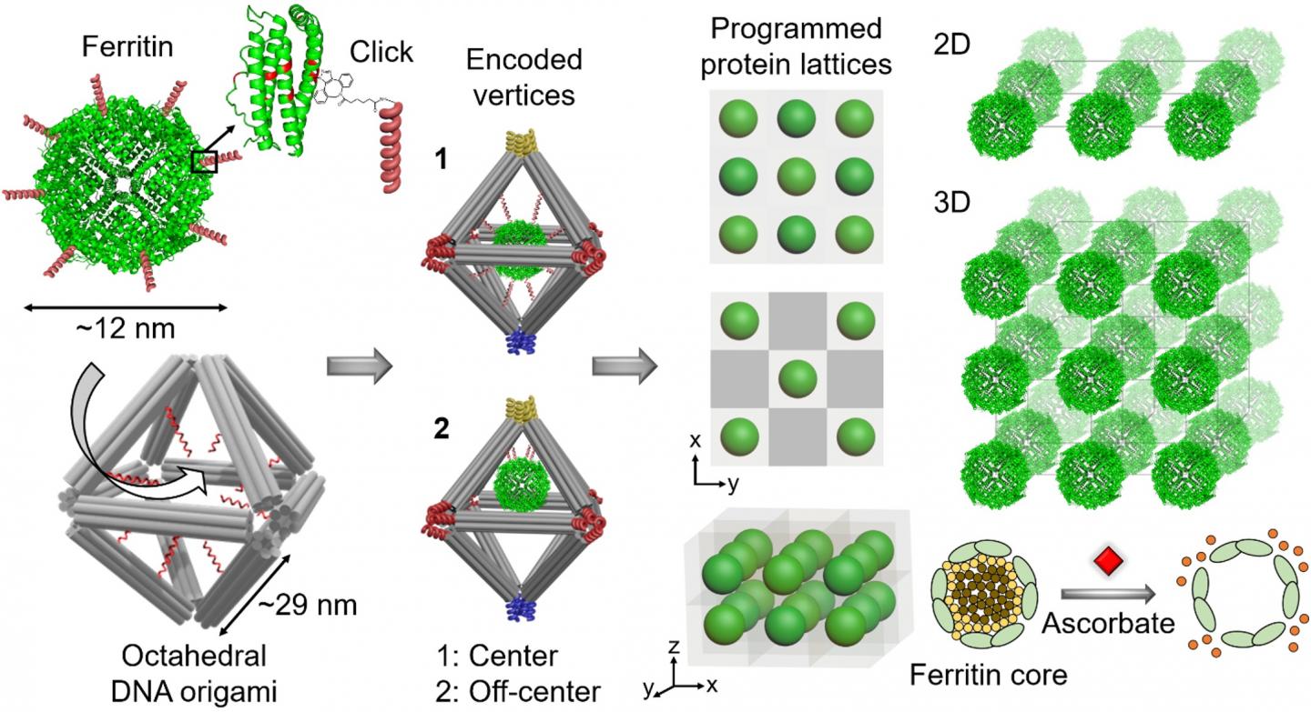 image: An illustration showing the approach for assembling biologically functional proteins into ordered 2D and 3D arrays through programmable octahedral-shaped DNA frameworks. These frameworks can host and control the placement of the proteins internally -- for example, at the center (1) or off-center (2) -- and be encoded with specific sequences externally (color coding scheme) to create desired 2-D and 3-D lattices. For example, red only connects to red, blue to blue, and so on. The team demonstrated the preserved biological activity of ferritin lattices by adding a compound (ascorbate) that induced the release of iron irons forming the ferritin core.