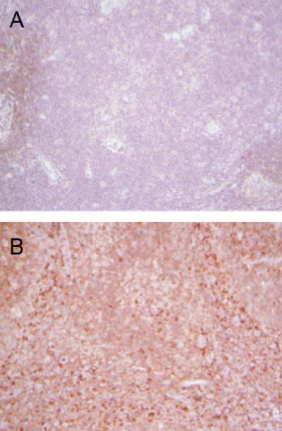 Using a technique that makes the presence of Protein S visible under the microscope, samples taken from lymph nodes with resting T-cells reveal no sign of the protein (A), while dark staining indicates the presence of Protein S in activated T-cells (B).