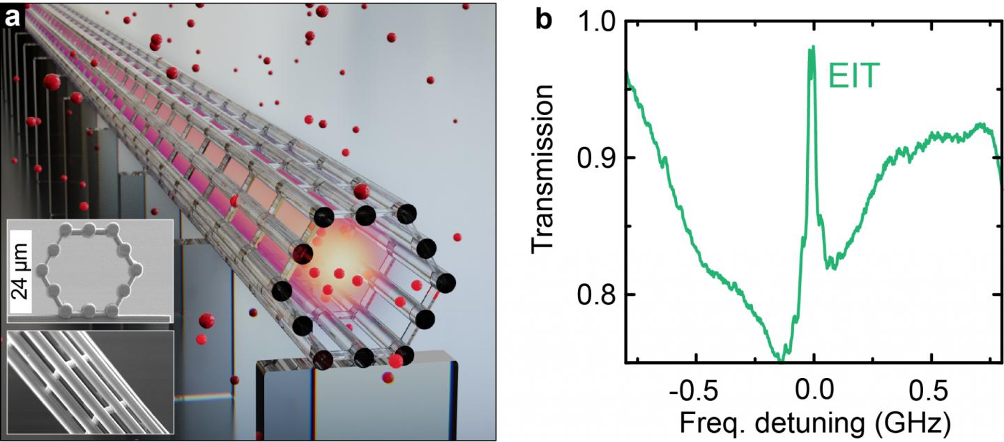 The researchers adopted the compact, easy-to-handle light-guiding structure of the laterally-accessible light cage as a container for coherent light-matter interaction, thus realizing stable non-degrading performance and extreme versatility. As a result, the observation of electromagnetically-induced transparency, a prominent quantum-optical effect, inside the novel on-chip hollow-core light cage demonstrates its potential for applications in quantum optics.