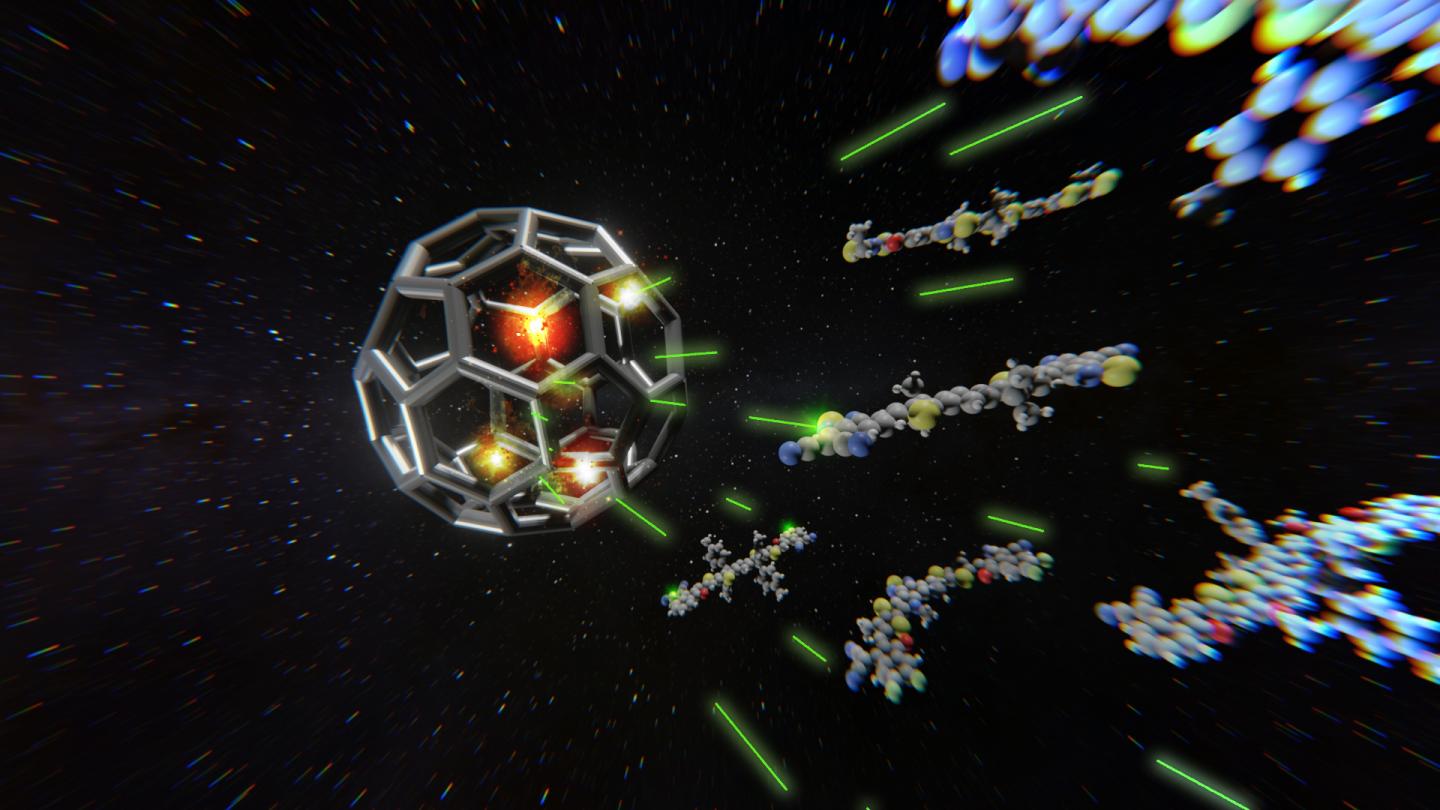 By pairing donor and acceptor materials, one creates a solar cell. In an organic solar cell, light-particles ("photons") transfer their energy to electrons. Excited electrons leave behind positive charges, called "holes". These electron-hole pairs are then separated at the interface between the two materials, driven by the differences in the electron affinity and ionization energy.