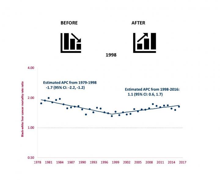 Results of the study, just published in EClinical Medicine, showed that from 1979 to 1998, racial inequalities in mortality from liver cancer in the U.S. were declining, but, from 1998 to 2016, racial inequalities steadily increased. From 1998 to 2016, of the 16,770 deaths from liver cancer among blacks, the excess relative to whites increased from 27.8 percent to 45.4 percent, and the trends were more prominent in men. Concurrently, racial inequalities in mortality decreased for major risk factors for liver cancer, including alcohol, obesity and diabetes.
