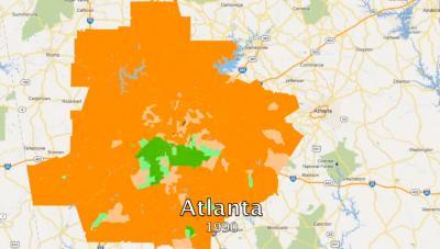 Of the 53 metropolitan areas studied by Professor Wright, Atlanta has undergone some of the most significant demographic change over the last 20 years. The map above shows a predominately white (represented in orange above) and African American (represented in green above) population in 1990.