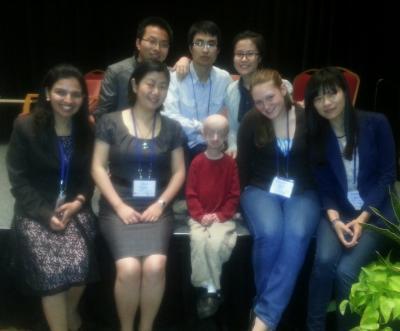 University of Maryland Asst. Prof. Kan Cao (front row, center left) and her research team met with progeria patients like Devin Scullion (front row center), age 16, at the Progeria Research Foundation International Workshop in April 2013. The fatal genetic disorder causes children to age prematurely and die of heart attacks or strokes. "It's a lot of motivation for us to work quickly," said Cao.