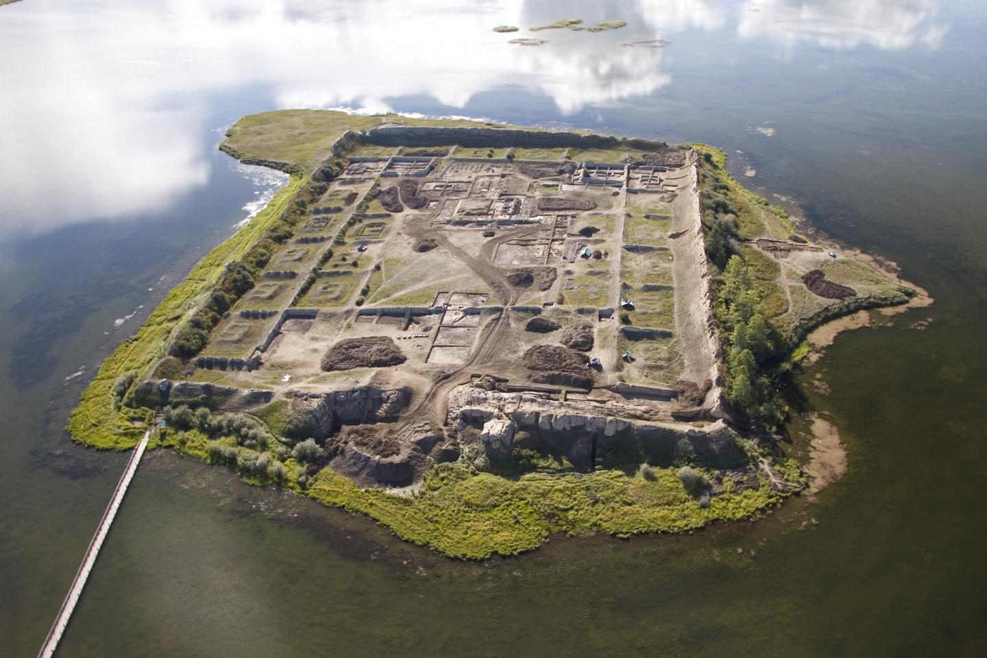 image: This is an aerial view of Por-Bajin from the west. The complex is situated on an island in a lake. Scientists have pinned its construction on the year 777 CE, using a special carbon-14 dating technique, based on sudden spikes in the carbon-14 concentration.