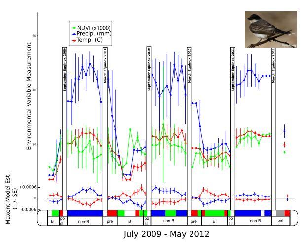 Tulane University's Maggie MacPherson and her colleagues combined field techniques with species distribution models to investigate which environmental factors drove the migrations of Eastern Kingbirds and Fork-tailed Flycatchers. Using geolocators, devices that record a bird's daily location based on day length, they could track where individuals of each species went. The two species share similar behavior and habitat requirements, but differ in their range and migration strategies, and these strategies were compared to determine the influence of temperature, precipitation, and primary productivity (the amount of "green" vegetation). Precipitation turned out to be one of the most important predictors of their distribution, particularly in the non-breeding season.