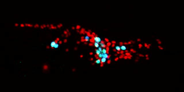 video: The brains of worms are not stationary inside skulls. Neurons (red) and other cells (blue) naturally shift position as an adult C. elegans eats or moves around in its environment. The head of this animal is on the right side of the video. Researchers were surprised to learn that neurons' locations vary between individuals as well.
