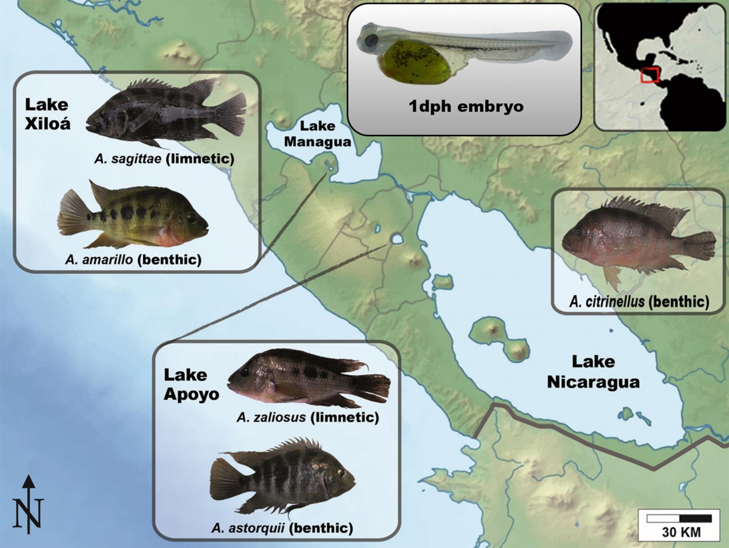 The researchers led by Axel Meyer analyze the Midas cichlid fish from Nicaragua's volcanic crater lakes as a model system in their research. Cichlids are known for their ability to adapt to new environments at an exceptionally rapid rate and to form new species. The new fish species originate from a population found in the large lakes of Nicaragua, but after colonizing several very small and young crater lakes, they adapted to new ecological niches, evolved new characteristics (e.g. a more elongated body or a different jaw) and evolved into a variety of new species in less than 22,000 years. A further distinctive feature of these Midas cichlids is that they evolved into different species within the same population, sometimes repeatedly, by adapting to different ecological niches within their small crater lakes. The Midas cichlids of Nicaragua are thus one of the best known examples for sympatric speciation. Within such a short time period new mutations are very unlikely to happen. This made finding a molecular mechanism that can bring about different body shapes, adaptations and thereby distinct ecological niches so difficult and interesting. The evolution of microRNAs and new target sites for them to regulate the expression of genes offers one potential molecular mechanism that can bring about very fast evolutionary change with very little genetic differences between the extremely young species.