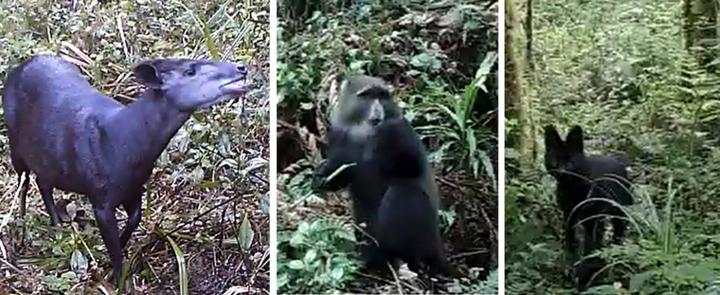 image: Three examples of the animal species filmed at Kilimanjaro (from left): an Abbott's duiker, a blue monkey and a black serval.