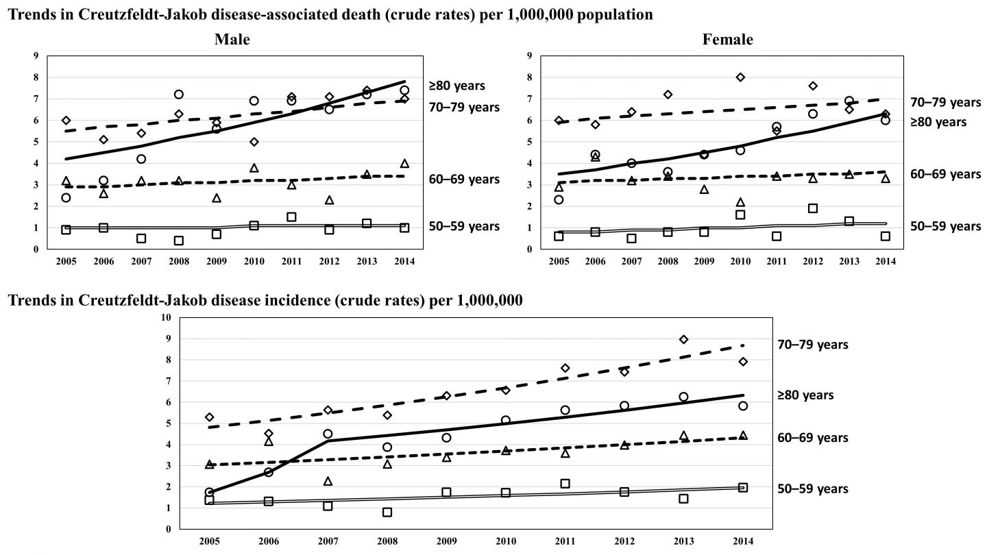 image: The trends of age-adjusted Creutzfeldt-Jakob disease (CJD) mortality rates in 2005-2014 by sex are shown (upper). The number of deaths almost doubled during this period. The incidence of CJD also doubled during this period (lower).