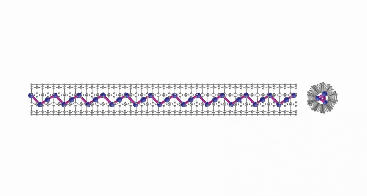 image: Researchers discover that a material forms a DNA-like helix when reduced to a string of atoms, as seen by the pink line in this graphic, encapsulated in a nanotube.