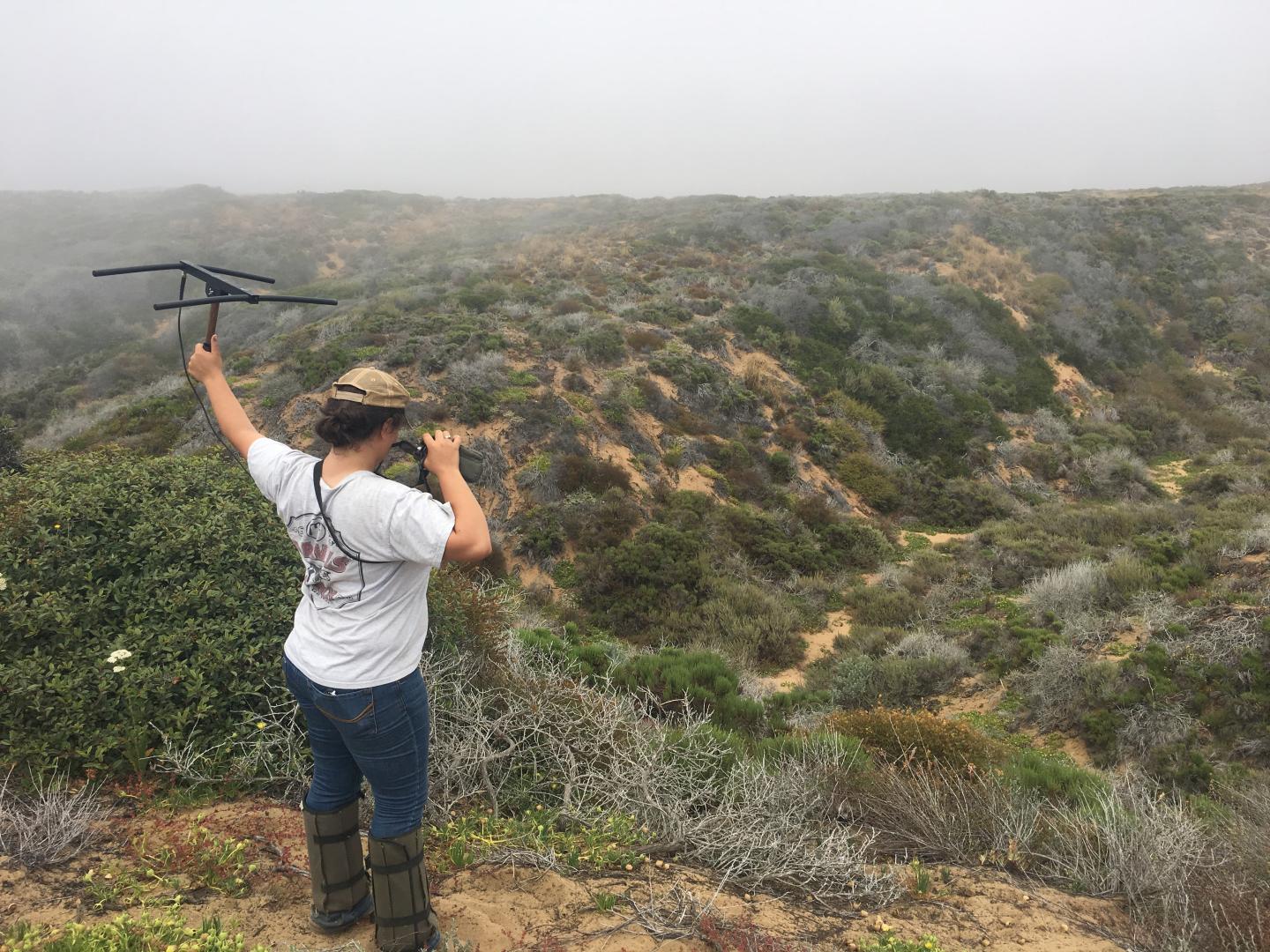 image: Former Cal Poly undergraduate Mallory Harmel radiotracks rattlesnakes at Montaña de Oro State Park near Los Osos, California, on a foggy morning in summer 2018.