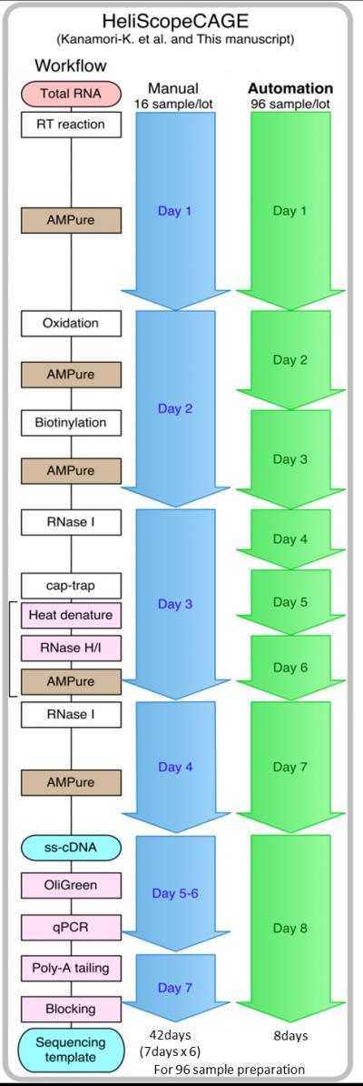 Researchers at the RIKEN Omics Science Center (OSC) have developed a robotic workflow for sample preparation on the HeliScope single molecule sequencer which drastically reduces sample preparation time to from 42 days to only 8 days. The workflow uses Cap Analysis of Gene Expression (CAGE), a unique method developed at the OSC for determining transcriptional starting sites in the genome and their expression levels.