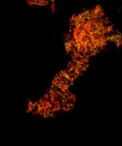 Amyloid fibrils in semen, shown here in red, enhance HIV infection by helping HIV -- shown in green -- find and attach to its target, CD4 T white blood cells.