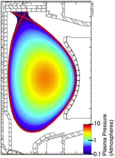 Surfaces of constant plasma pressure in the cross-section of the C-Mod tokamak for an I-mode plasma. In the hottest core region, the pressure exceeds 4 atmospheres. The volume average pressure is over1.5 atmospheres, more than 50 percent of the central pressure expected in the ITER device, and close to the current tokamak world record of 1.8 atmospheres, also attained on C-Mod