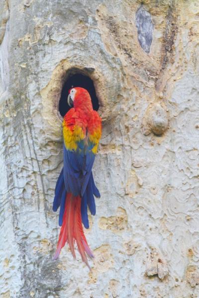 A scarlet macaw adult visits its nest in the Maya Biosphere Reserve in Guatemala.