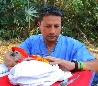 Melvin Merida, a field veterinarian for the Wildlife Conservation Societys Guatemala Program performs a medical checkup on a wild macaw chick in the Maya Biosphere Reserve.