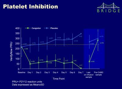 The first stage of BRIDGE identified the cangrelor dose that maintains a "thienopyridine-like" level of platelet inhibition. The second stage reported today was a prospective, randomized, double-blind, placebo-controlled trial in 210 patients with an acute coronary syndromes (ACS) or treated with a coronary stent (bare metal stent or drug eluting stent) on a thienopyridine awaiting coronary artery bypass grafting (CABG). After thienopyridine discontinuation (<72 hours), patients were administered cangrelor or placebo for at least 48 hours and up to 7 days, which was discontinued 1-6 hours prior to CABG. The objective was to demonstrate that a cangrelor IV infusion would maintain levels of platelet reactivity <240 P2Y12 Reaction Units (PRU) throughout the pre-operative period as measured by a P2Y12 assay.