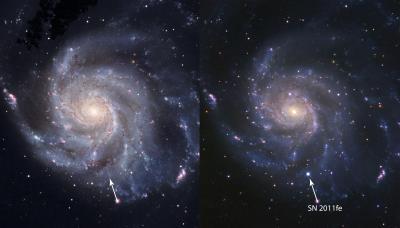 This is the Pinwheel Galaxy before (left) and after (right) the supernova called SN2011fe happened. It's the brightest and closest stellar explosion seen in 25 years.