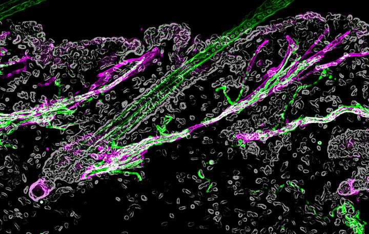 image: The hair follicle under the microscope, with the sympathetic nerve in green and the muscle in magenta.