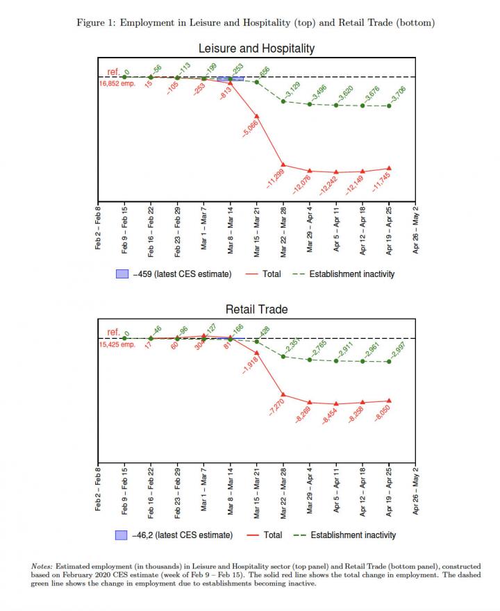 "Our report complements a number of concurrent efforts to measure the real-time impact of the crisis on labor markets," he said. "We provide a direct estimate of establishment inactivity and, going forward, the extent to which the U.S. labor market is starting to recover as restrictions are lifted and the economy opens up again."
