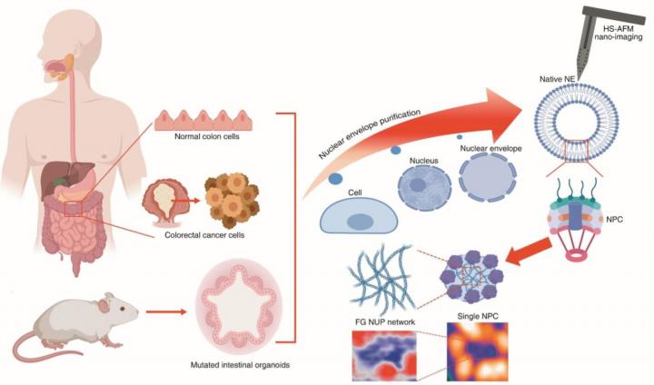 image: Schematic illustration of manipulation and tracking of native nuclear nano-pores from colon cancer cells and mouse organoids. Live tracking of single bio-filament conformations inside the nuclear pore presented as a nano diagnosis tool for the colorectal cancer.