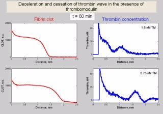 This movie demonstrates the deceleration and cessation of the thrombin wave in the presence of thrombomodulin (TF density is 4 pmol/m2). Upper row: When the thrombomodulin concentration is high enough (1.5 nM), cessation of the thrombin wave can be observed. Light scattering intensity profile (left) and thrombin concentration profile (right) are shown. Clot growth rate decreases up to the full stop, and spreading of the thrombin wave stops. Lower row: In the case of a lower thrombomodulin concentration, the thrombin peak decelerates gradually, with a decrease in height (right). Light scattering profiles are shown on the left.