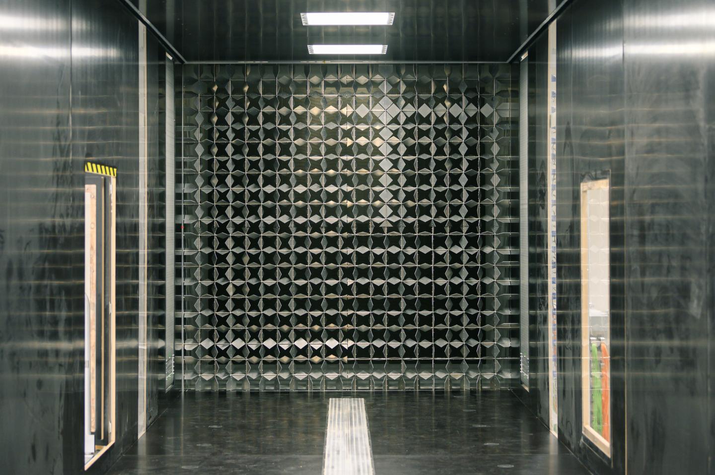 image: The active grid in the wind tunnel can stir up air flows to generate realistic storm turbulence.