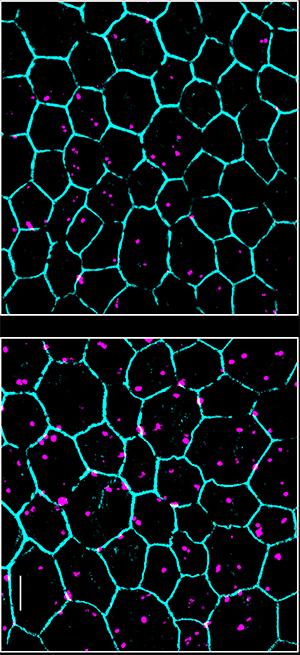 image: Healthy mouse retinas (top) with support cells (outlined in blue) and photoreceptors (purple). In the CIB2 mutant mouse retina (bottom), the photoreceptors are not digested as fast and accumulate.