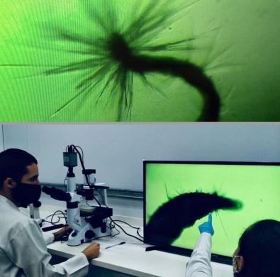 image: A schistosome seen under the microscope (top) and students of Professor Josué de Moraes at the Center for Research on Neglected Diseases