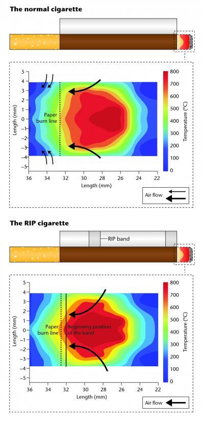 Scientists have created temperature maps to explain how reduced ignition propensity (RIP) bands influence cigarette burn rate and possibly the chemical composition of the resulting smoke.